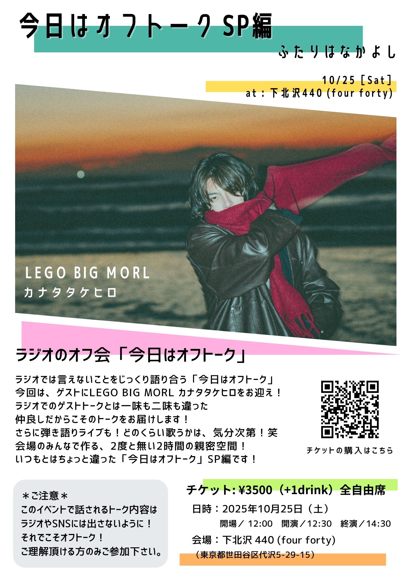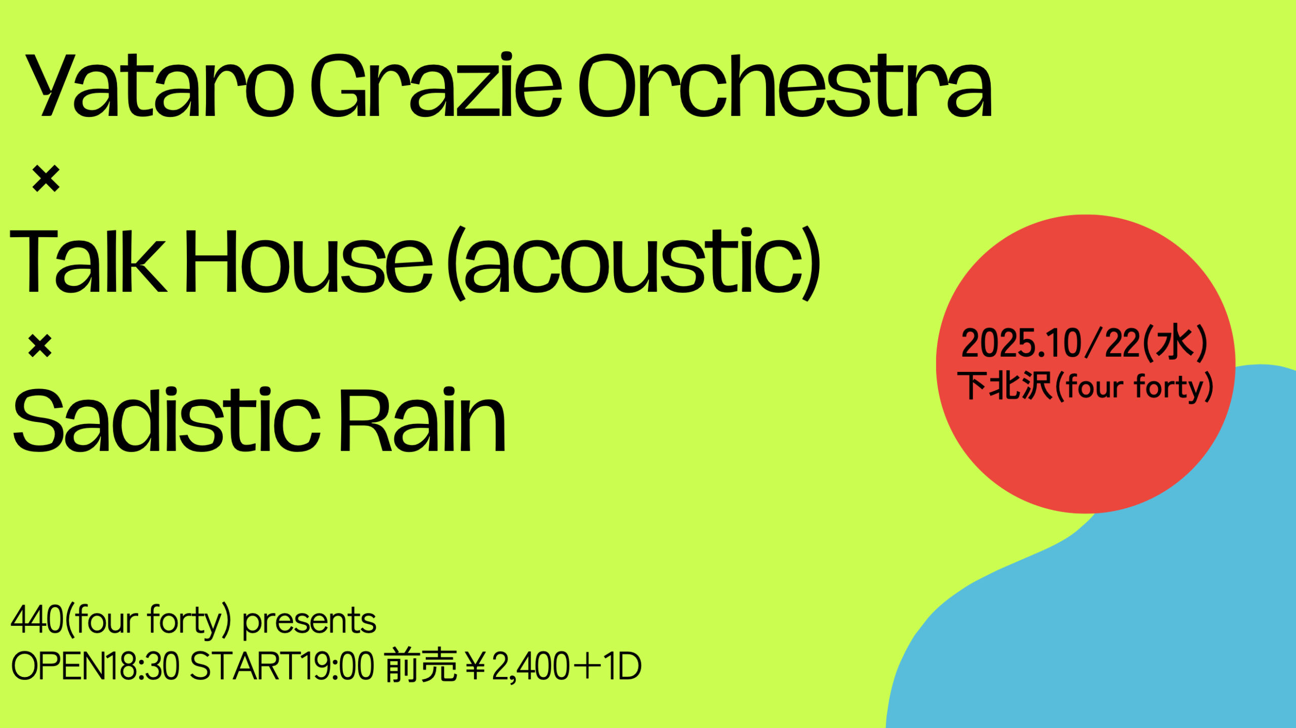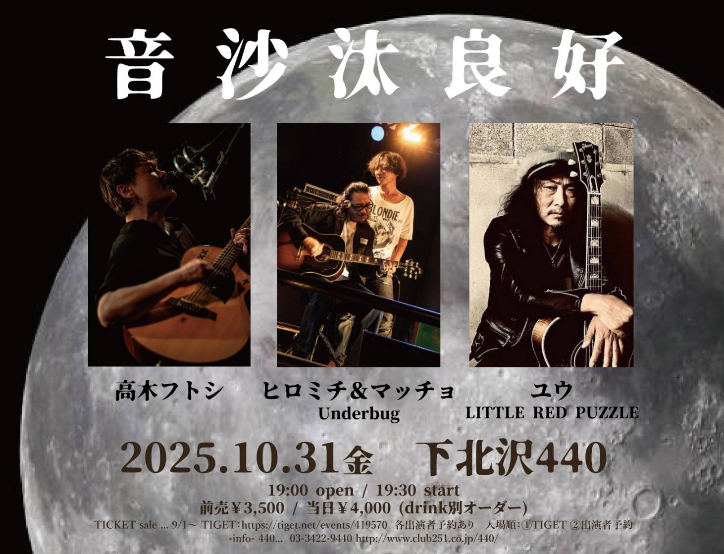 配信有り中川敬・音曲渡世ひとり旅2025<東京・秋篇>~ソウルフラワー中川敬の弾き語りワンマン・ライヴ!中川敬(ソウル・フラワー・ユニオン) OPEN 17:30 / START 18:00 CHARGE : 前売 ¥4,000- / 当日 ¥4,500- (+1D) 学割チケット前売り¥2,000(ドリンク別/税込) / 当日¥2,500(ドリンク別/税込)/配信チケット¥3000 TICKET:TIGET→7/29 10:00 配信TICKET:https://twitcasting.tv/440_fourforty/shopcart/386539 【特記事項】 ※中学生以下は入場無料。(保護者同伴でご入場ください) ※学割チケットは高校生・大学生の方が対象となります。(学生証をご持参ください。ご入場順につきましては、一般チケットの整理番号をお持ちの方の後になります。一般チケットをお持ちの方と同伴の場合はご一緒にご入場できます。) ※「託児所」等お子様をお預かりする施設、スタッフ等はご用意しておりません。公演中はお子様から目を離さないようご注意ください。 ※付き添いが必要な障がい者の方に限り、介護の方1名は入場無料とさせていただきます。(障がい者手帳を必ずご持参下さい) ※会場内での録音・撮影は一切禁止とさせていただきます。 ※当日はライブ配信を行うため、会場の最後方とステージ両脇にカメラマンの撮影スペースがございます。 ステージ脇のカメラマンが立ち上がることはございますが、お客様とステージの間を遮るようなことの無いように努めます。 |