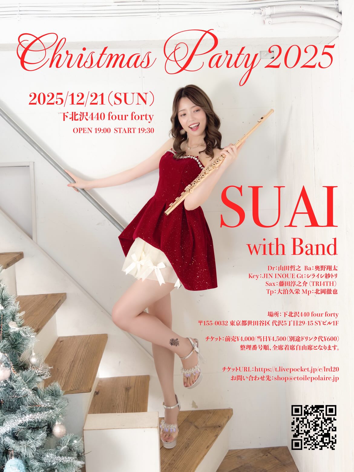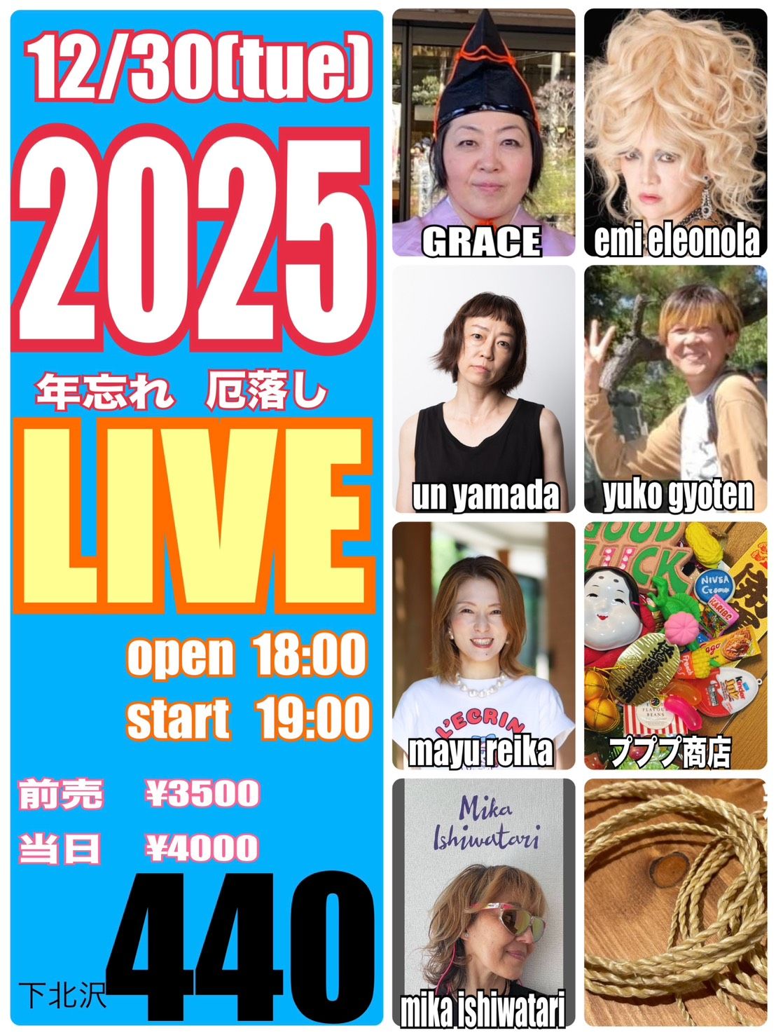 “開運!占いLIVE” presents『2025 年忘れ厄落としLIVE』エミ・エレオノーラ (pf., ソングライティング)/GRACE (ds., ソングライティング、占い)/行天裕子 (総合司会、うどん県)/GUEST:山田うん (振付師、開運体操)/繭由怜佳 (東洋占星術、トークと占い)/石渡美佳 (精麻製品の販売、マッサージ)/プププ商店 (開運グッズ)/Tomock’s Deli (開運、厄落としフード) OPEN 18:00 / START 19:00 CHARGE : 前売 ¥3,500- / 当日 ¥4,000- (+1D)