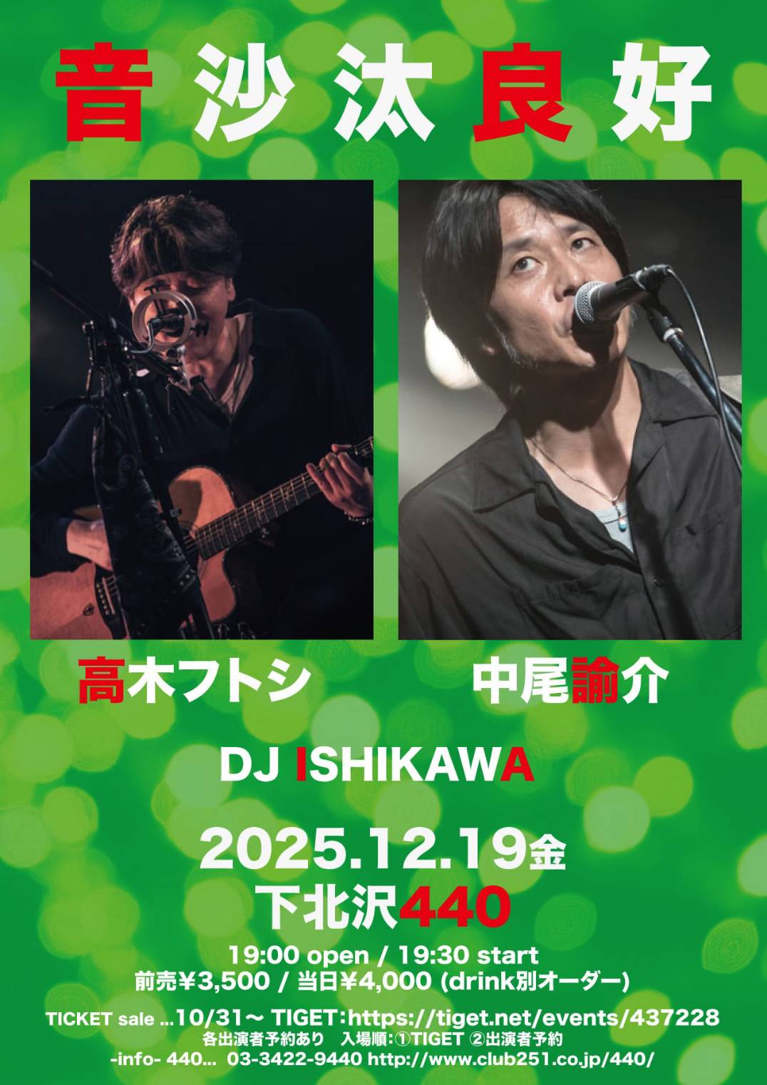 TICKET:TIGET→10/10 10:10 毎年3月に440(four forty)にて開催している「開運!占いLIVE」より、年末の厄落としライブの開催が決定。 ご来場の皆さんの2025年厄落とししたいことを、エミさんとGRACEさんの即興開運ソングで厄払い! GRACEさんと繭由怜佳さんによる2026年を幸運に過ごすトークライブもあり、 山田うんさんの開運体操をみんなで一緒に体を動かして、 うどん県在住の行天裕子がうどん県の楽しいうどん旅のススメ、など。 また会場内にて、 繭由怜佳さんのミニ占い(15分2000円)、石渡美佳さんのミニマッサージ(10分1000円) 石渡美佳さんの作る精麻のアクセサリーやパロサントのツボ押し棒の販売、 プププ商店さんの手作りの開運グッズ販売、 Tomock’s Deliさんの開運厄落としフードのブースなど、盛りだくさんです! ご来場の皆さんには、GRACEさんから一言おみくじと星座別開運カードをプレゼント。 笑う角には福来る!笑顔で明るい新春を迎えましょう~! |